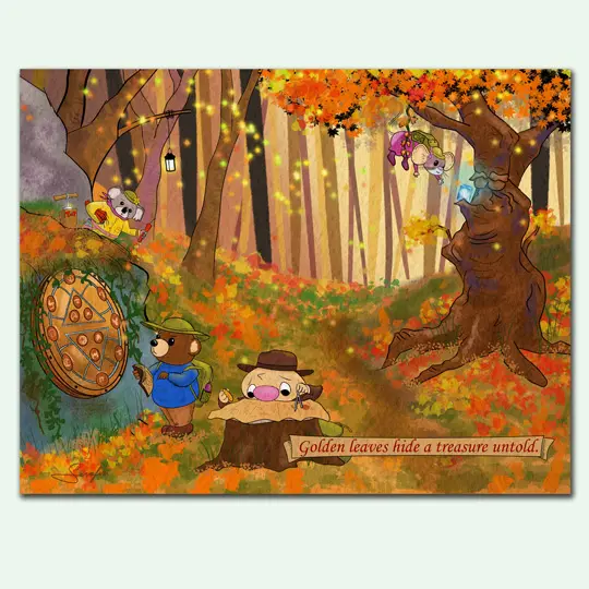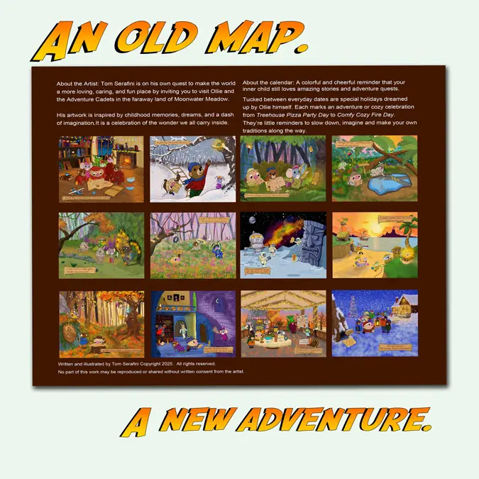 This year’s Ollie adventure story calendar isn’t just a way to keep track of days, it’s a 12-month illustrated quest told in twelve mini picture-book chapters. Follow Ollie, Bearly-There Bear, Clarence, Ticklebit, Limon, Artemouse, Gordon, and Spoon as they uncover an ancient map and begin a year-long journey through Moonwater Meadow.