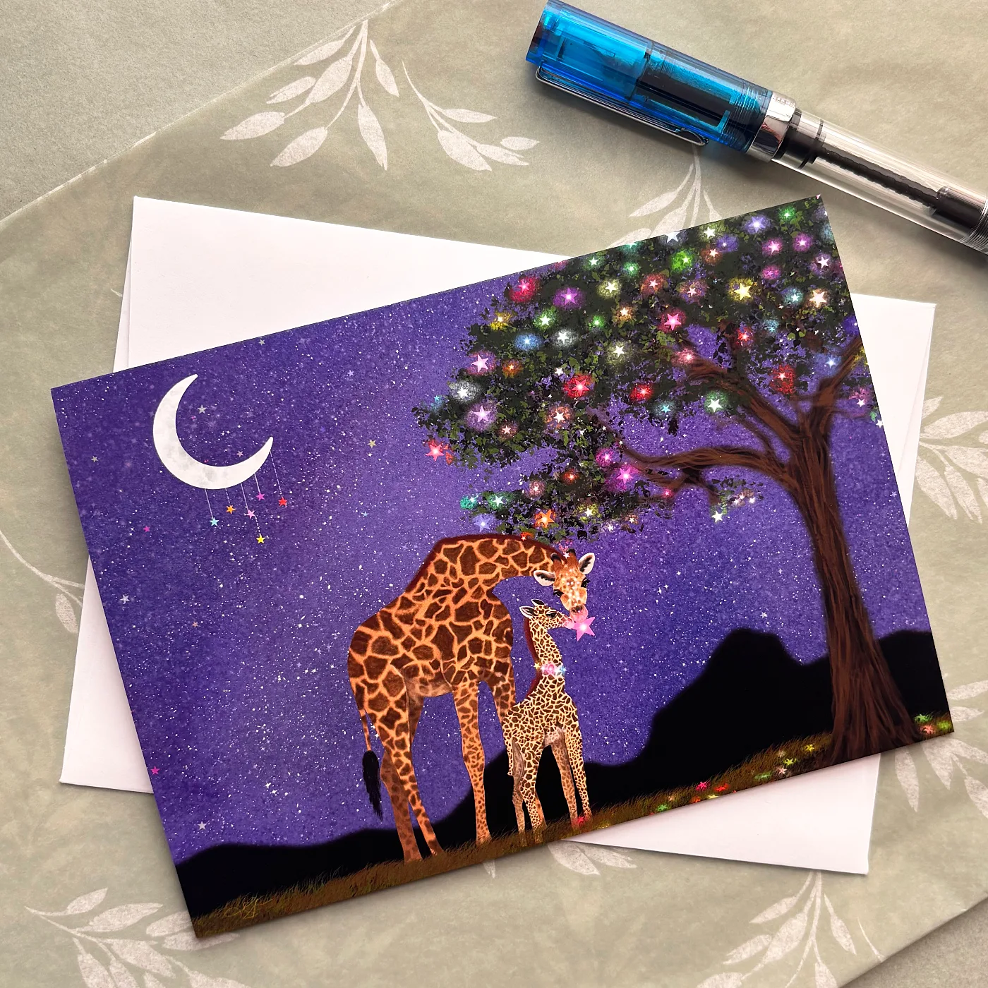 This giraffe greeting card captures a mama giraffe bending her impossibly long neck down to nuzzle her baby, who offers her a glowing pink star under a sky full of colored light. The magical star tree glows beside them, the crescent moon hangs its own stars like ornaments in the night air, and the deep purple savannah sky stretches out behind them. Tracy Serafini’s luminous night world at its most tender.