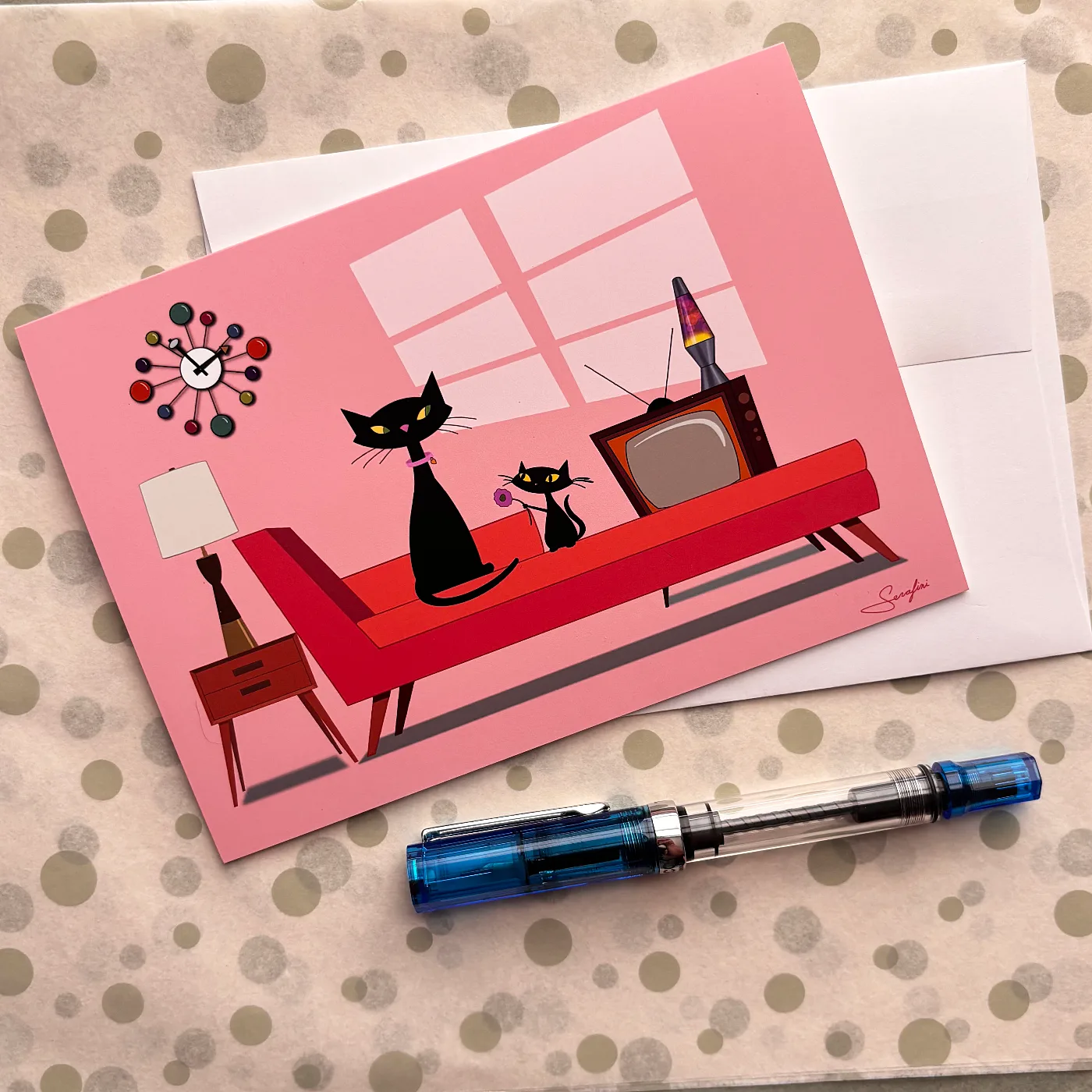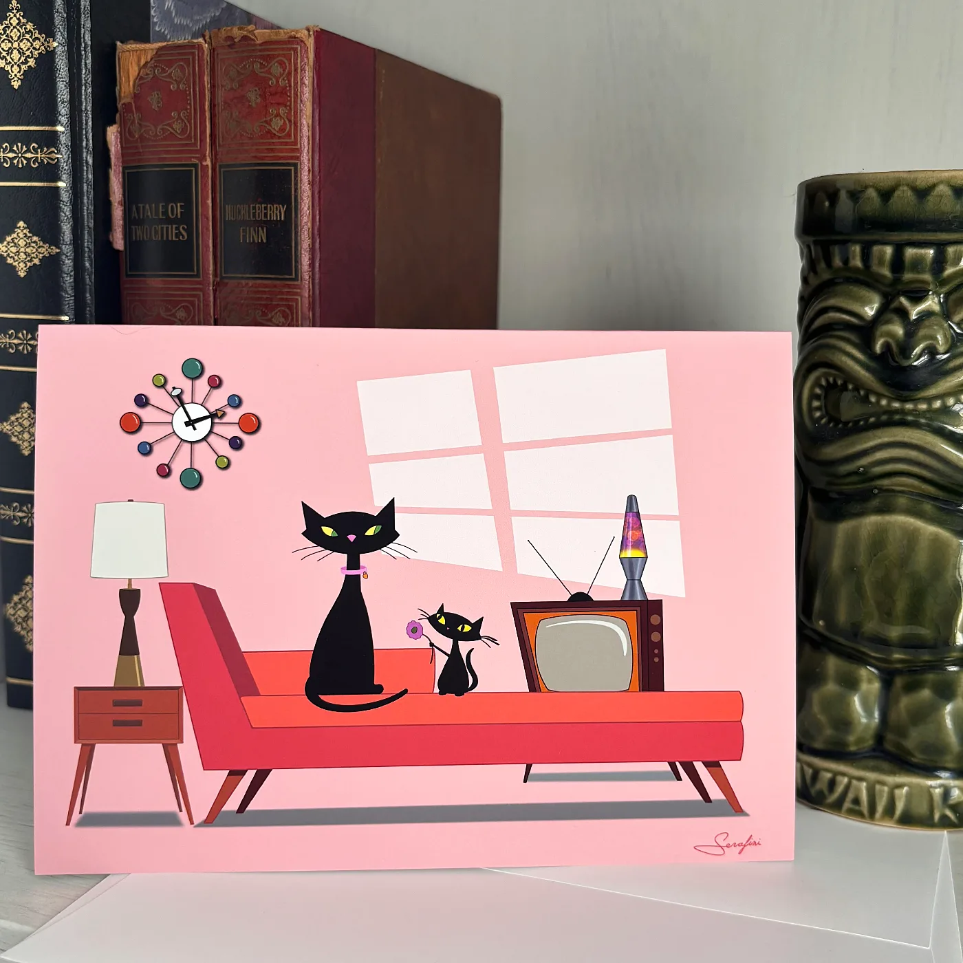 This mid century modern cat card captures a sleek black mama cat sitting on a red chaise lounge, her tiny kitten right beside her offering a small flower. A George Nelson clock on the pink wall, a lava lamp glowing nearby, a vintage TV with rabbit ears in the corner. The whole scene is warm and stylish and a little bit perfect.