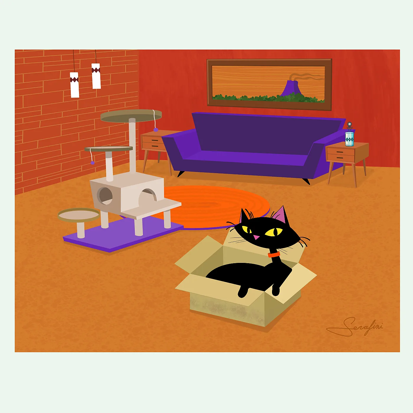 Set against a warm mid century modern living room complete with brick accent wall, atomic age pendant lights, a volcano painting above the couch, and a cat tree nobody is using, this piece is part of the Serafini Mid Century Modern Cat collection, painted by Tom Serafini. It is a love letter to every cat owner who has ever stood there holding a receipt and staring at a cardboard box.