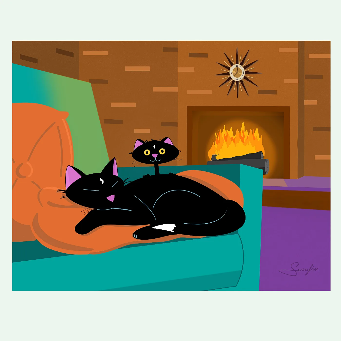 This cat art print features mama cat curled up in perfect feline contentment on a teal mid-century modern sofa beside a roaring fireplace.Her kitten, however, has other ideas — wide eyed, fully alert, and perched directly on mama’s back like a tiny chaotic co-pilot. The starburst clock ticks. The fire crackles. Somebody is definitely not napping.