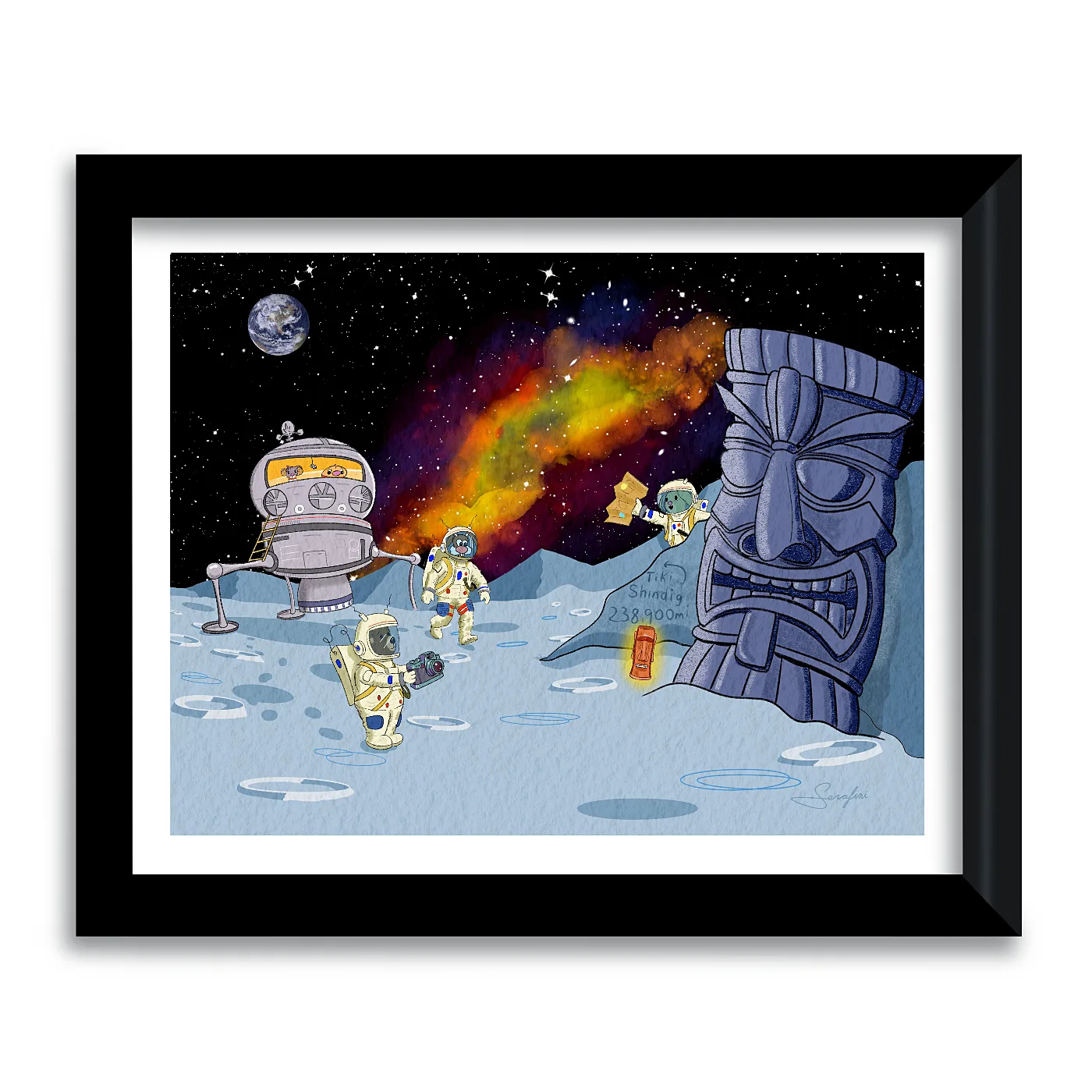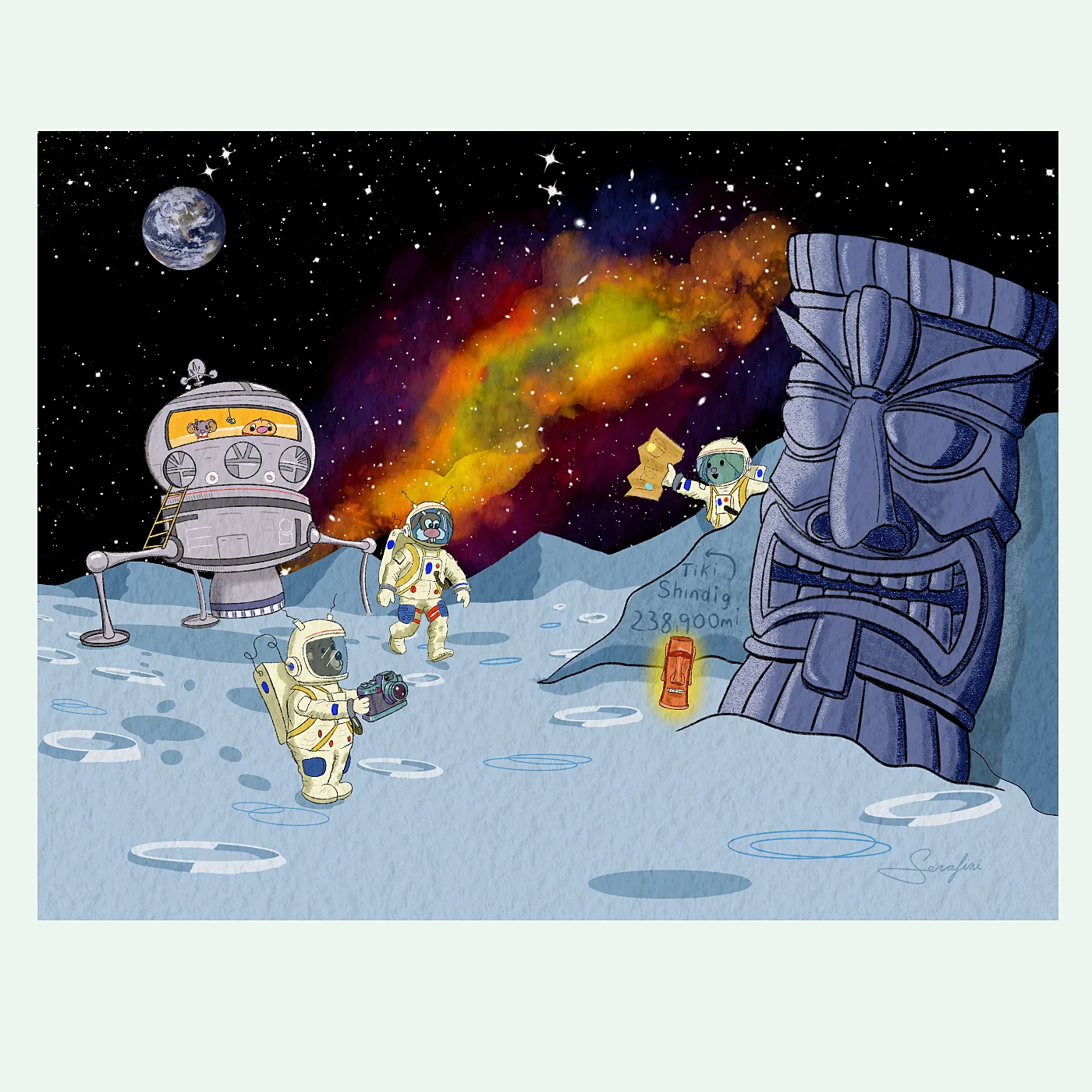 This adventure art print finds the Moonwater Meadow Adventure Cadets on the moon. How they got there is a matter of some debate. Why they got there is written all over Limon’s map. Bearly There Bear is documenting everything with his camera because someone has to. Ticklebit is walking confidently toward a giant Tiki statue on the lunar surface because of course he is. Back in the landing capsule, Ollie and Artemouse are watching from the window, which is either very wise or very cowardly. A glowing Easter Island head lights the way. A sign on the rock reads “Tiki Shindig, 238,900 mi” pointing back toward Earth, which is hanging in the sky right where they left it.
