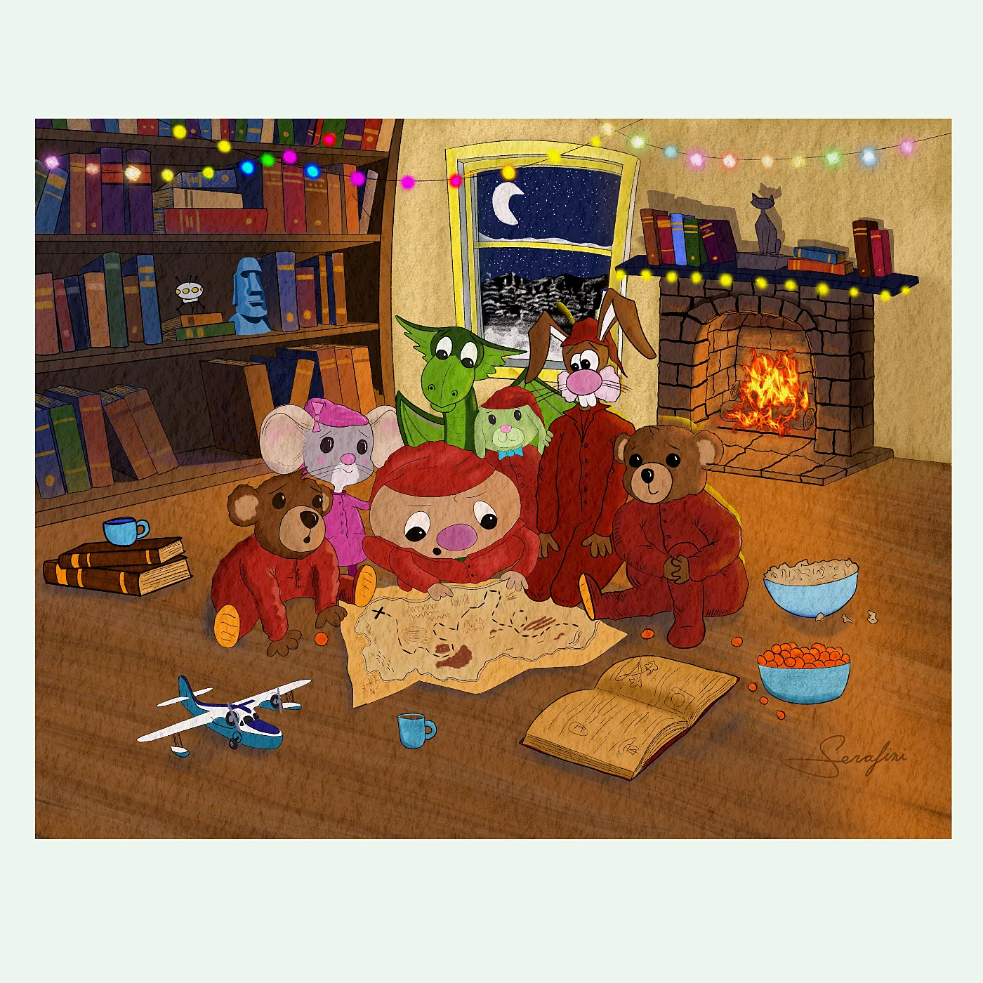 This cozy art print captures the Moonwater Meadow Adventure Cadets on the best kind of night. Pajamas on, treasure map spread across the floor, fireplace roaring, string lights glowing, and the crescent moon keeping watch outside the window. Ollie is at the center of it all, surrounded by Artemouse, Gordon, Limon, and the rest of the crew, deep in the serious business of planning their next great adventure. A seaplane sits ready on the floor. Books are stacked within reach. Snacks are very much present.