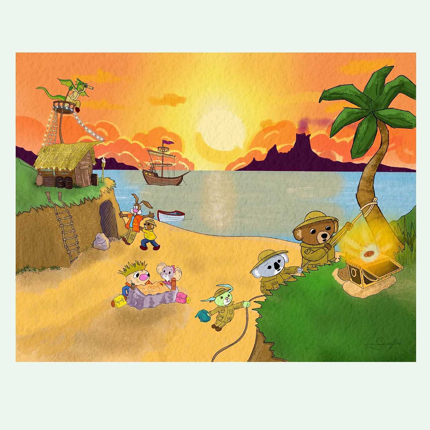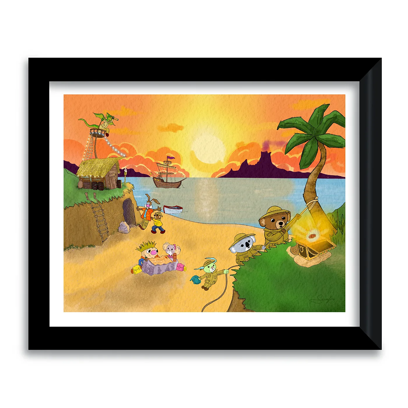 This Treasure Beach adventure art print captures the whole gang mid quest on a golden sunset beach. Ollie and Artemouse are huddled over the map, working out the details. Bearly There and Ticklebit are on the beach exploring the cave. Clarence, Spoon, and Limon are climbing a rope up to a cliff where a glowing treasure chest waits. Gordon is up in the lookout tower keeping watch, because someone has to. A pirate ship is on the horizon. A rowboat is pulled up on the shore. The thatched hut is there if anyone needs a moment.