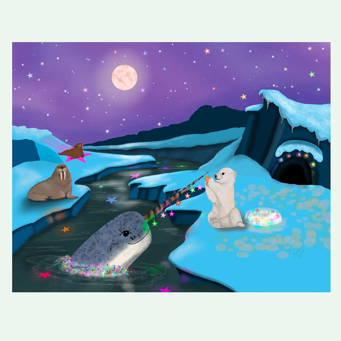 A polar bear cub hangs stars on a friendly narwhal while a little walrus slides down a star on the ice and mama walrus watches it all unfold, under Tracy Serafini’s magical Arctic night sky. Tracy Serafini’s luminous night art turns the frozen Arctic into a place of pure wonder and play.
