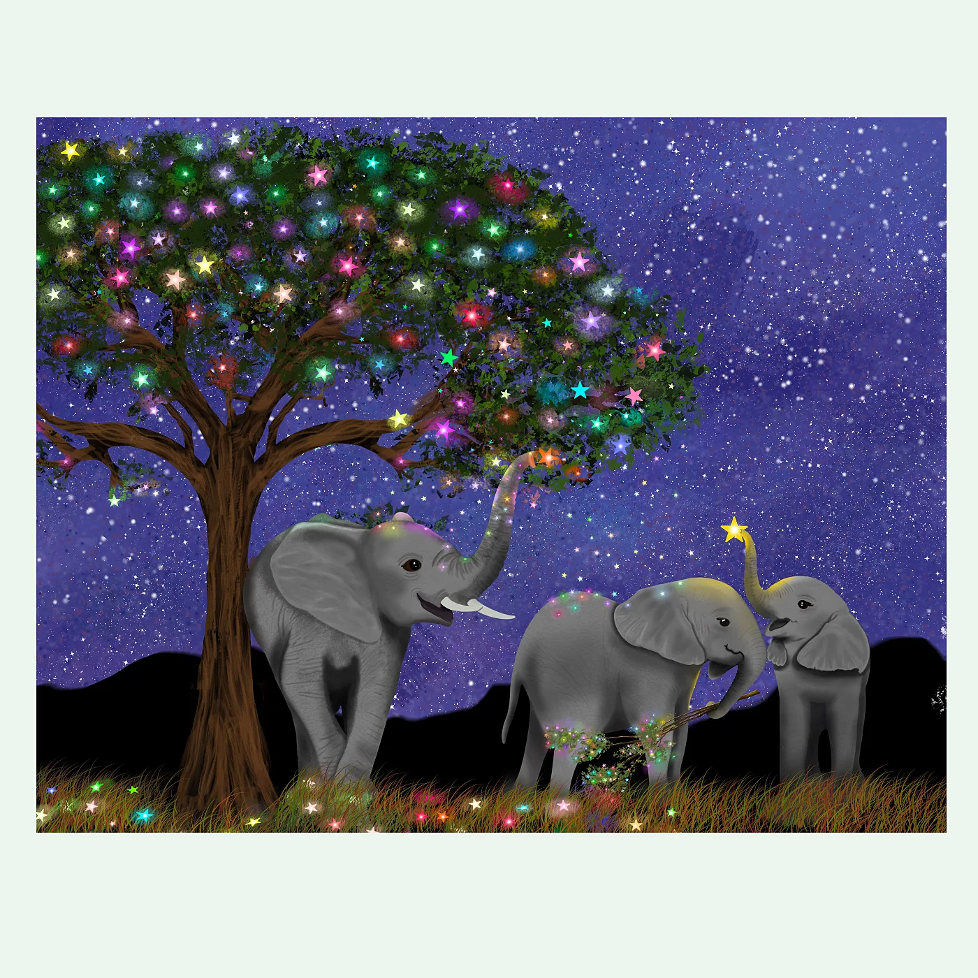 Three young elephants discover a magical star filled tree on the savannah at night, one reaching into the glowing branches, one holding a bough of starlight, one lifting a single star on the tip of its trunk. Tracy Serafini’s luminous night art, printed on archival matte paper.